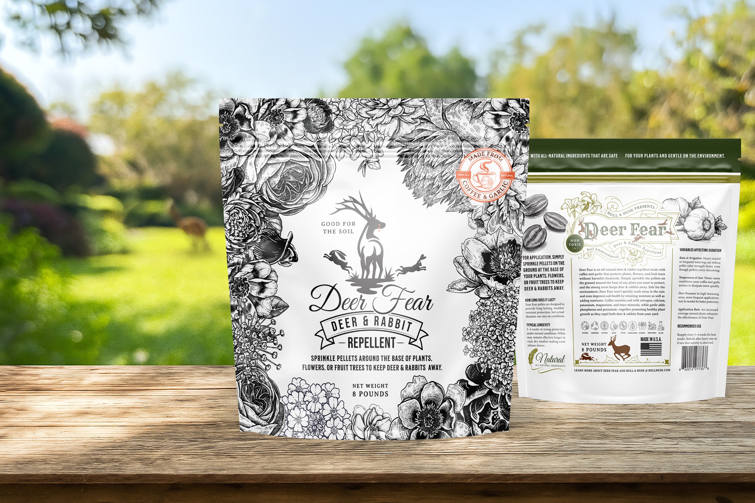 Pelletized coffee + natural repellents (e.g., garlic-based blends) for gardens, landscapes, and field edges.
